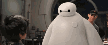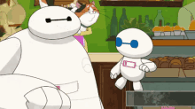 - Бэймакс — надувной медицинский робот, созданный старшим братом Хиро, Такудзо. Бэймакс отличается дружелюбным, спокойным и заботливым характером, несмотря на своё гигантское и необычное тело. Озвучивание робота осуществил Скотт Адкинс, придав голоса герою теплоты и мягкости, что особенно важно для создания эмпатичной связи с аудиторией.